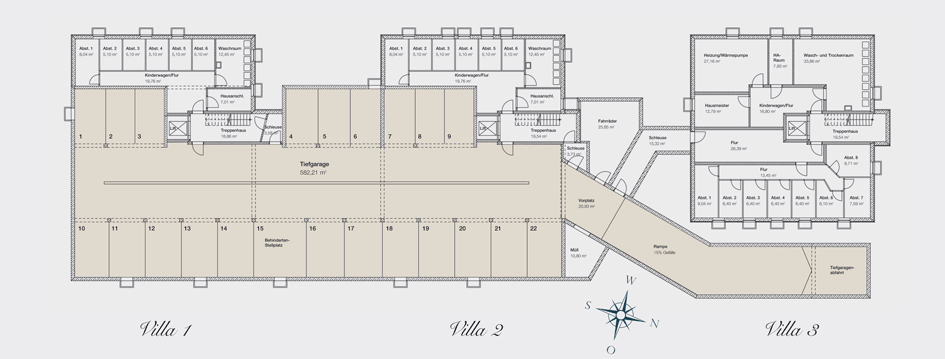 Im Untergeschoss liegt die Tiefgarage mit insgesamt 22 Stellplätzen, davon 1 extrabreiter Behindertenparkplatz. Außerdem befinden sich hier 1 Abstellraum für jede Wohnung, allgemeine Abstellflächen (Kinderwagen, Fahrräder), Waschund Trockenräume sowie Müll-, Hausmeister- und Heizungsräume.